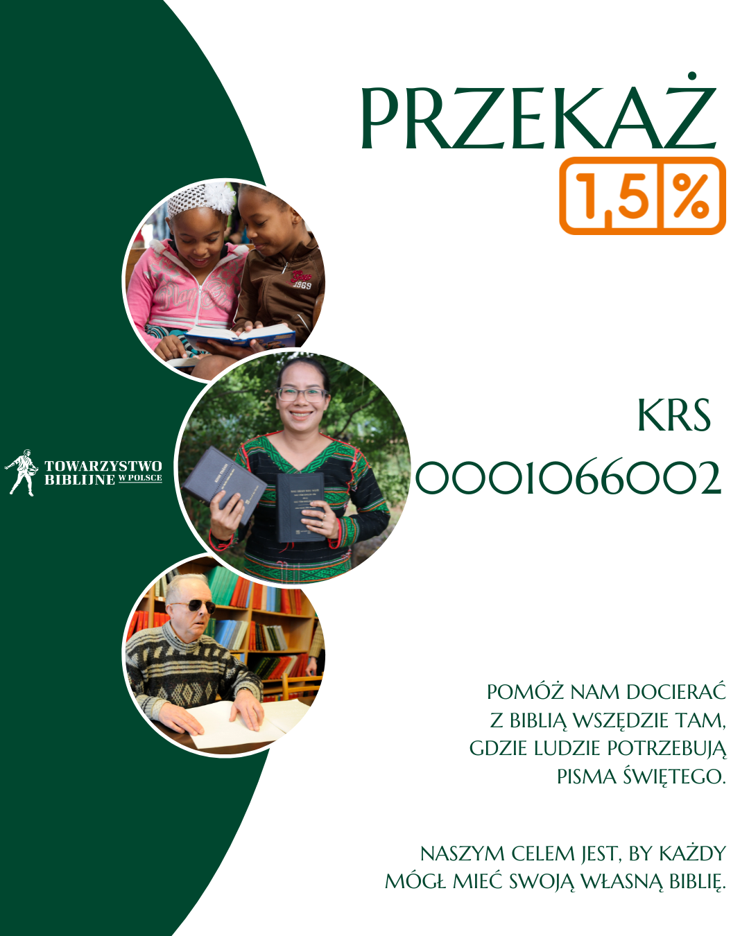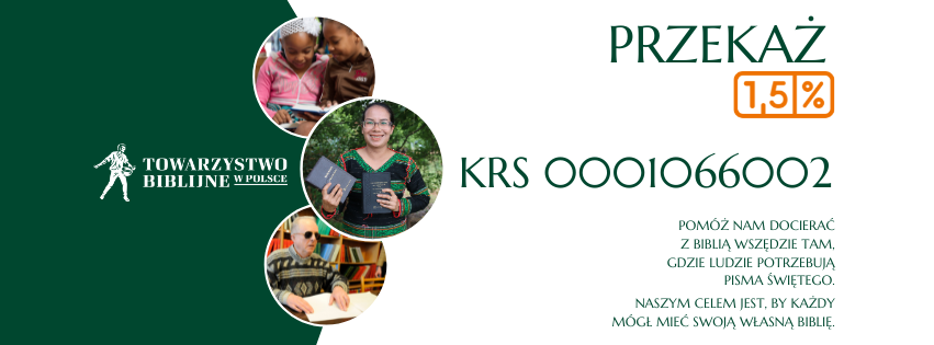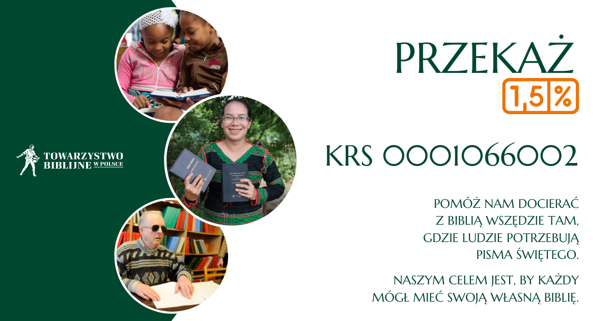 Towarzystwo Biblijne w Polsce jest organizacją pożytku publicznego (OPP), zatem każdy podatnik może przekazać nam swoje 1,5% podatku dochodowego wpisując w deklaracji podatkowej KRS 0001066002.